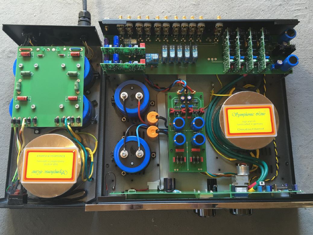 mit Turbonetzteil innen für Phonostufe, 140.000 μF, mit 300 VA Mumetall Transformator , Feindynamik Expander, Internationale Topklasse. Plus separatem Master Netzteil mit 280.000 μF, 300 VA Mumetall Transformator und Gleichrichtung. Überträgt einen unglaublichen Spannungsbogen in der Musik.