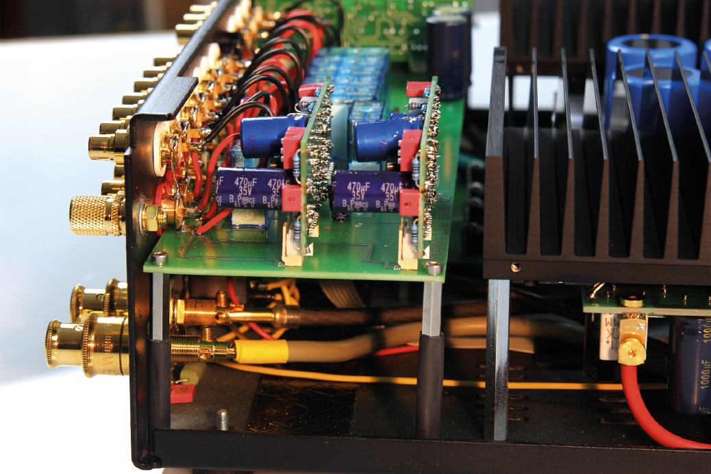 Modular aufgebaute volltransistorisierte Platine mit sehr kurzen Wegen. Eingänge: CD, Tuner, 2 x AUX, excellenter Phonoeingang, Wahl MM oder MC, 2 x Tape. Serie Kopfhörerausgang, Lautstärke Fernbedienung. Netzteil innen mit 300 VA Mumetall Transformator, 280.000 μF. Class A Schaltung. Gehäuse wahlweise Chrom, Schwarz oder Frontplatte Mattsilber. Zwei Ausgänge mit sehr stabiler Ausgangsstufe 20 Ohm.